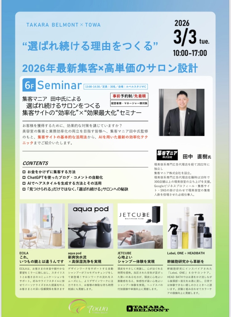 美容室の集客と業務効率化の両立を目指す皆様へ、集客マニア田中氏監修のもと、集客サイトの基本的な活用法から、AIを用いた最新の効率化テクニックまでご紹介いたします。