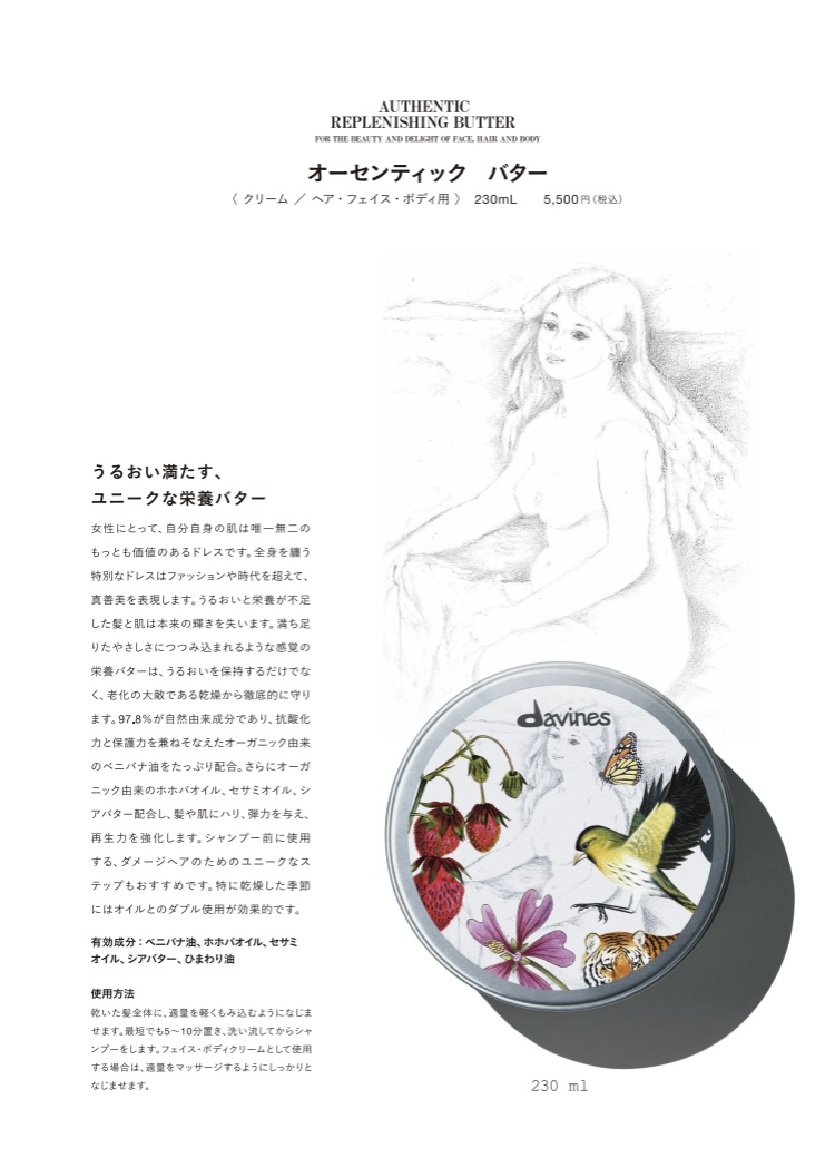 女性にとって、自分自身の肌は唯一無二のもっとも価値のあるドレスです。全身を纏う特別なドレスはファッションや時代を超えて、真善美を表現します。うるおいと栄養が不足した髪と肌は本来の輝きを失います。満ち足りたやさしさにつつみ込まれるような感覚の栄養バターは、うるおいを保持するだけでなく、老化の大敵である乾燥から徹底的に守ります。97.8%が自然由来成分であり、抗酸化力と保護力を兼ねそなえたオーガニック由来のベニバナ油をたっぷり配合。さらにオーガニック由来のホホバオイル、セサミオイル、シアバター配合し、髪や肌にハリ、弾力を与え、再生力を強化します。シャンプー前に使用する、ダメージヘアのためのユニークなステップもおすすめです。特に乾燥した季節にはオイルとのダブル使用が効果的です。