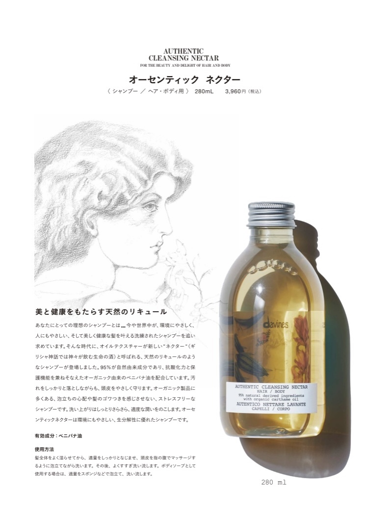 あなたにとっての理想のシャンプーとは…今や世界中が、環境にやさしく、人にもやさしい、そして美しく健康な髪を叶える洗練されたシャンプーを追い求めています。そんな時代に、オイルテクスチャーが新しい“ネクター“(ギリシャ神話では神々が飲む生命の酒)と呼ばれる、天然のリキュールのようなシャンプーが登場しました。95%が自然由来成分であり、抗酸化力と保護機能を兼ねそなえたオーガニック由来のベニバナ油を配合しています。汚れをしっかり落としながら、頭皮をやさしく守ります。オーガニック製品に多くある、泡立ちの心配や髪のゴワつきを感じさせない、ストレスフリーなシャンプーです。洗い上がりはしっとりさらさら、適度な潤いをのこします。オーセンティックネクターは環境にもやさしい、生分解性に優れたシャンプーです。